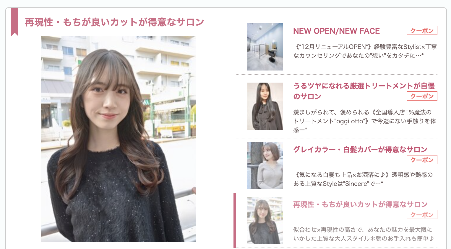 新着ヘアスタイルやカテゴリ別検索に加え、条件を設定した絞り込み検索も可能です。お好みの写真を簡単に探せます。